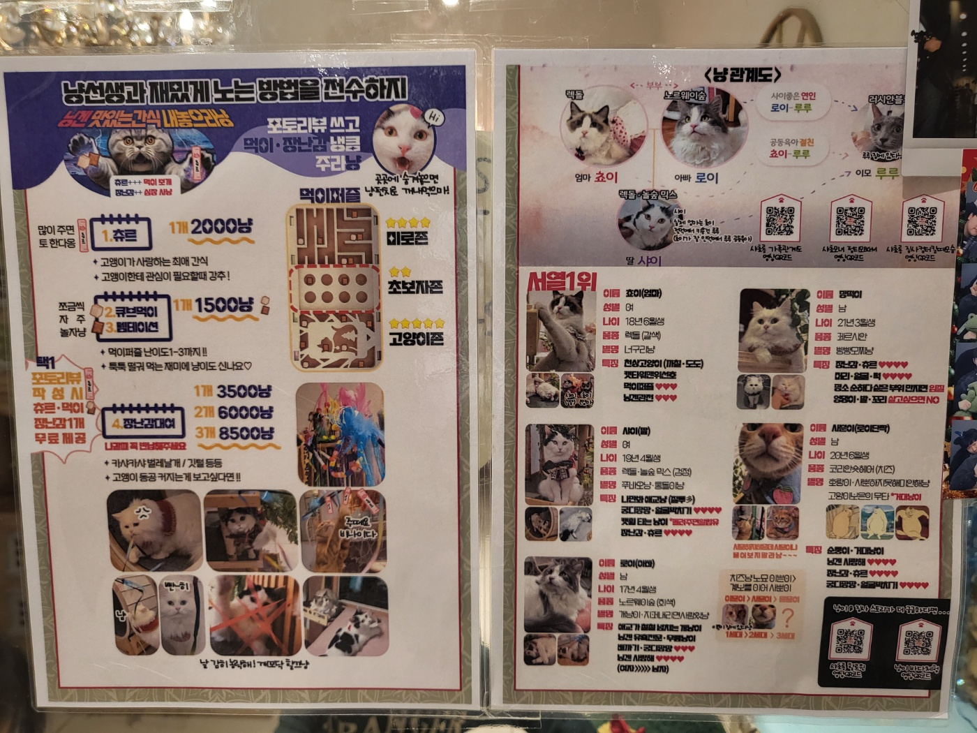 고양이들은 정말정말 귀여웠어요. 제가 갔을 때는 거의 모든 고양이가 자고있었고 한마리만 움직이고 있었는데, 그 고양이가 엄청난 개냥이였습니다. 홀린듯 츄르구매할 뻔 했습니다; 사람을 매우 좋아해서인지 거의 문 열면 튀어나올 것 같아서 들어갈 때 겁먹었는데, 그냥 사람을 좋아하는 고양이었습니다.