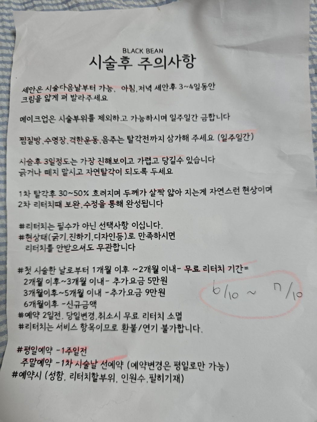 저는 시술 후 주의사항도 열심히 지키려고 노력했어요. 운동은 많이 하긴 했지만, 찜질방, 음주, 메이크업은 피했습니다.
