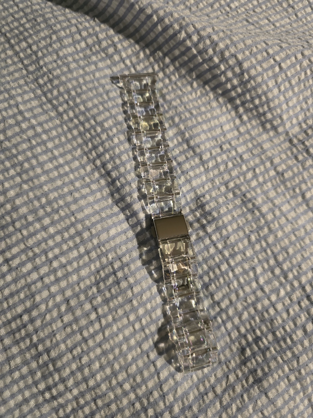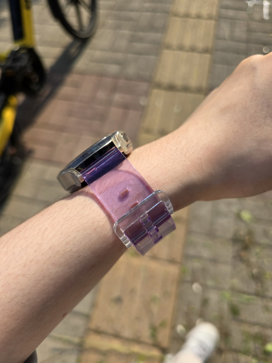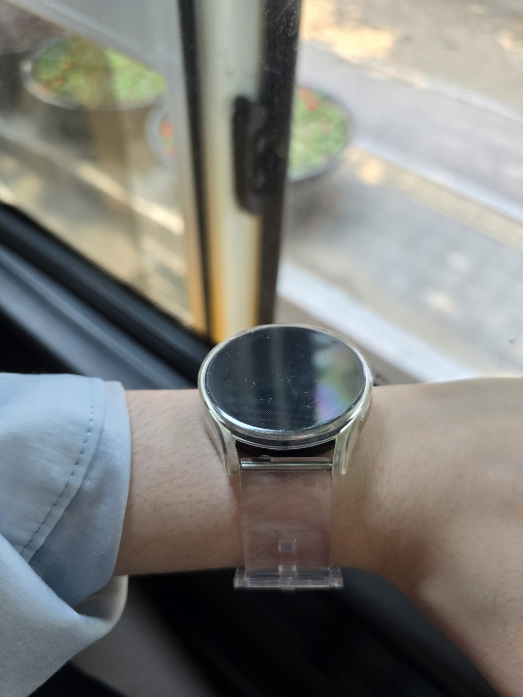 햇빛에 따라 색이 달라지는 스트랩입니다. 나름 예쁠 것 같아 구매했는데 시계줄 구멍도 넉넉하게 뚫려있고 만족했습니다. 햇빛이 어느 정도인지 측정할 수 있는 느낌이라 재미있다고 생각했는데, 실내에서 주로 착용하니 그냥 투명스트랩과 똑같은 것 같습니다. 그래도 놀러 갔을 때 '나 햇빛 받고 있네'라는 기분을 낼 수 있어서 좋은 것 같습니다.