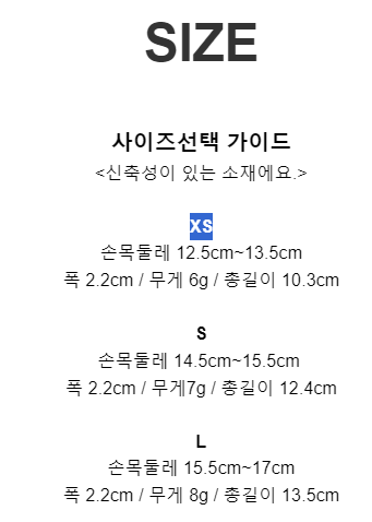 손목이 매우 얇기 때문에 XS(12.5~13.5) 거나 시계줄 조정이 가능한 스트랩으로 알아봤습니다. 솔직히 손목 둘레 잘 모르겠어서 작을까 봐 걱정했는데 오히려 큰 거 사면 못쓸 뻔했습니다.(리뷰에 초등학생도 쓴다고 적혀있어서 고민했습니다.)