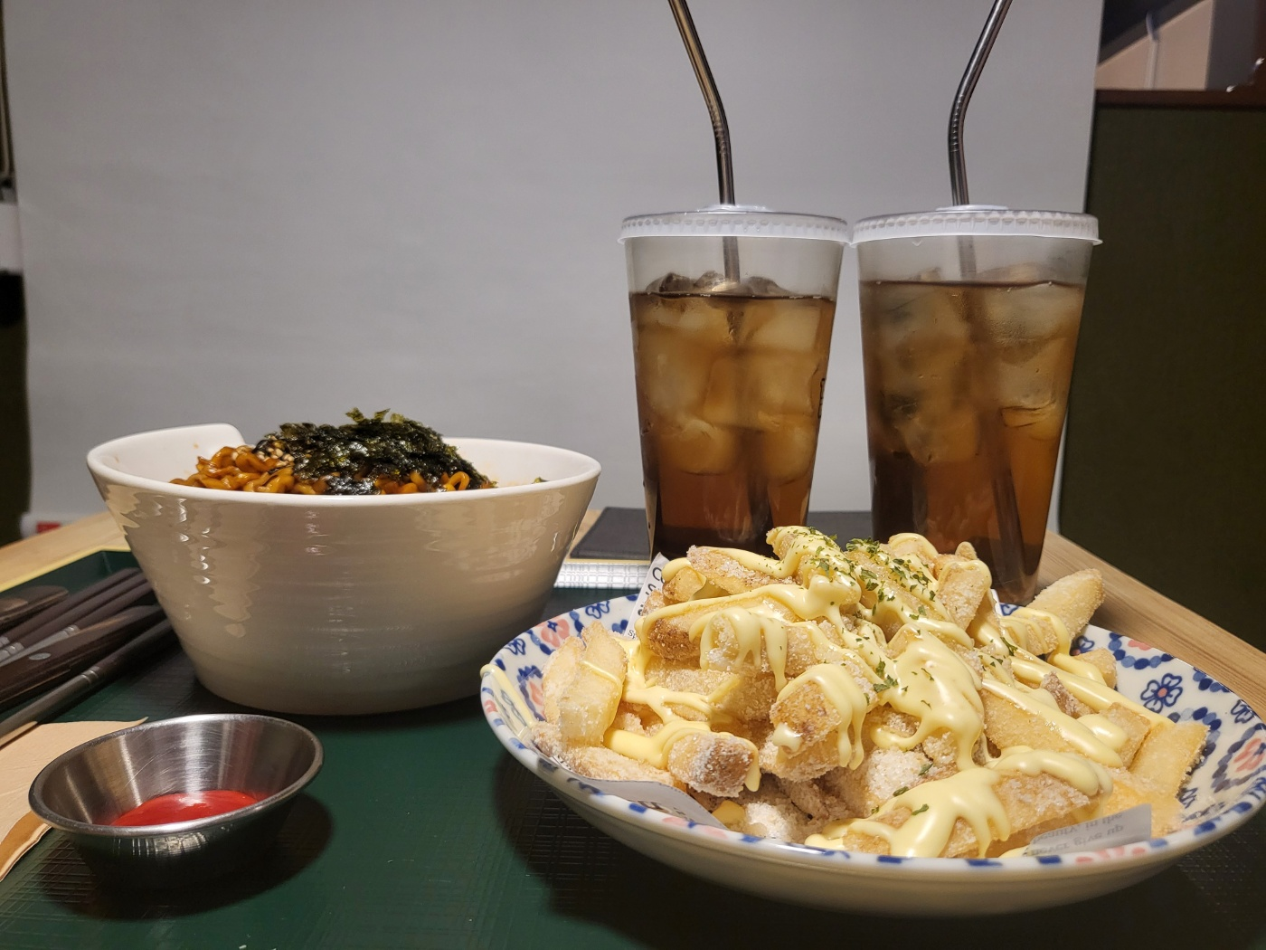 저희는 5시간권을 끊어서 인당 19,000이 나왔습니다. 위에 말했듯 저는 만화카페 음식을 좋아하는데요, 방문한 날은 '갈릭허니버터프라이'와 '불닭게티'를 시켰습니다. 불닭게티는 카운터에서만 주문가능한 아주대점 특별평일한정메뉴였는데요, 카운터쪽에 있는 토스포스기(작은 키오스크같이 생긴것)으로 구매할 수 있었습니다.