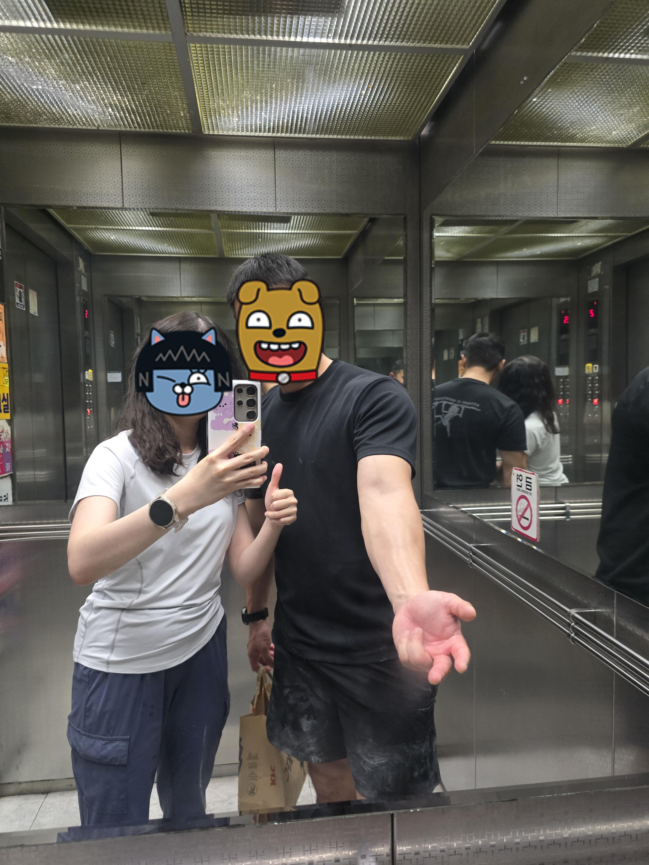 나오는 엘리베이터에서 오빠가 전완근 잘 털렸다(?)라면서 뿌듯하게 같이 찍은 사진입니다. 초보자도 할 수 있는 코스가 있는 클라이밍장이 중요하다고 생각하는데, 뀨클라임은 너무 높지 않으면서 여러 스킬들을 높일 수 있는 공간인 것 같습니다.