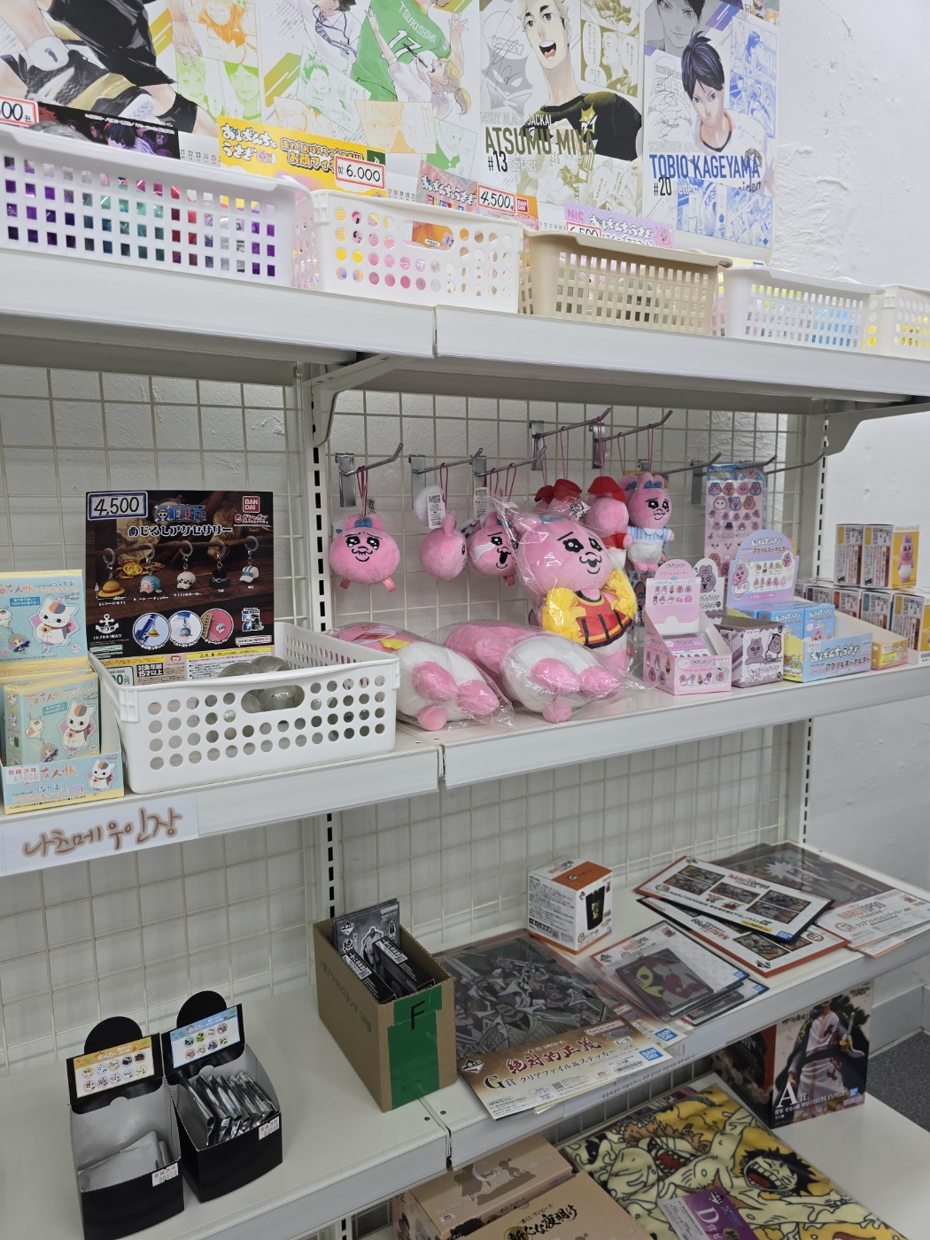 예전에 친구한테 사줬던 먼작귀 안대도 있어서 반가워서 찍었습니다. 친구가 갖고싶어하던 커비 피규어는 이 가게가 싼 편이었어서 이미 많은 사람들이 쓸어갔더라고요. 친구가 사고 싶었던 것들을 주섬주섬 담았습니다. 가게 내부가 엄청 큰 편은 아니었지만 알차게 다양한 장르들을 많이 볼 수 있었습니다.