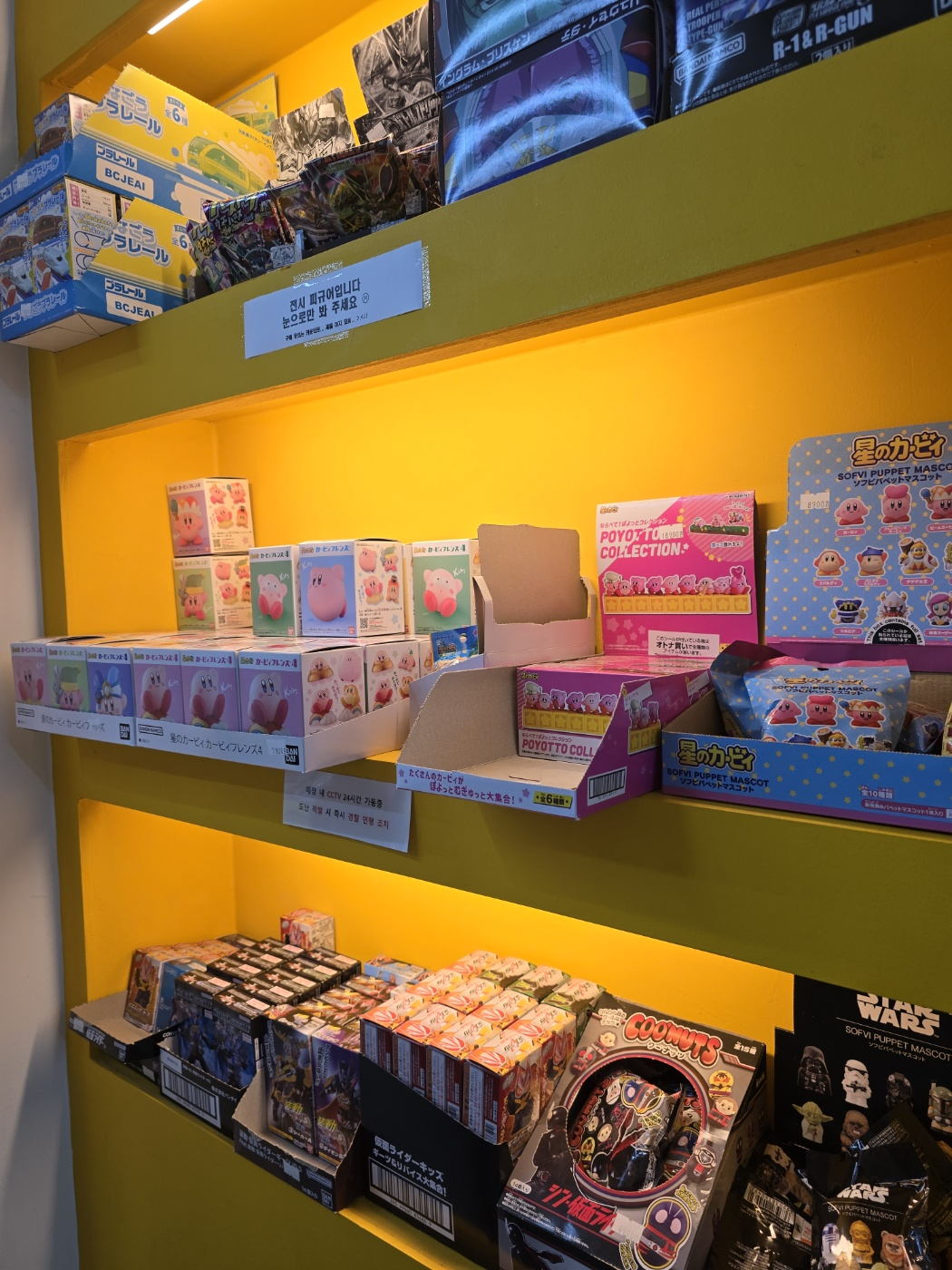 친구가 사려던 커비 피규어가 굉장히 많은 곳이었습니다. 확정 피규어여서 시크릿 피규어(커비가 타고 있는 무지개 색이 다름)가 나왔으면 좋겠다 하고 구매해서 열었는데, 바로 히든이 나와서 좋아했던 기억이 납니다. 싼 편은 아니었지만 재고가 넉넉해서 좋았습니다.